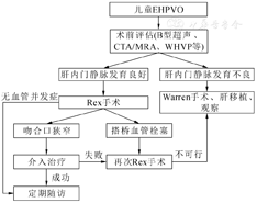 对于吻合口狭窄介入治疗失败和搭桥血管栓塞的患儿,再次Rex手术仍是安全有效的治疗措施。本研究中再次Rex手术共16例,12例采用颈内静脉做搭桥血管。术后再发栓塞2例,吻合口狭窄4例,狭窄患儿经介入治疗后恢复良好。总体血管通畅率为87.50%,其中颈内静脉达91.67%。再次Rex术后大部分患儿脾大、脾亢及食管静脉曲张均得到缓解。当前对于Rex手术失败后的治疗策略仍存在争议,主要原因之一是研究病例数少,文献报道不多。对于Rex术后早期血栓形成的患儿,可行介入溶栓治疗,但效果并不理想[13]。对于晚期血栓栓塞的患儿,手术治疗是更合适的选择。文献中再次Rex手术成功率为50.00%~66.67%[13,27],因而有学者认为并发症更少的Warren手术应作为Rex手术失败后的首选手术治疗方式[27]。然而,本研究表明再次Rex手术依旧是行之有效的一种治疗策略。从原理上讲,对于EHPVO患儿,Rex手术可以重建入肝血流,符合人体生理状态,是一种根治性手术方式,而Warren手术并不能解除门静脉梗阻和恢复肝脏正常灌注,仅用于降低脾胃区静脉压力,减少上消化道出血风险。因而本团队的观点是支持再次Rex手术作为Rex手术失败后的首选手术治疗方式,若再次Rex手术不可行,比如Rex窝闭锁或无合适的搭桥血管,则可选择Warren手术或肝移植。EHPVO患儿管理流程见图1。