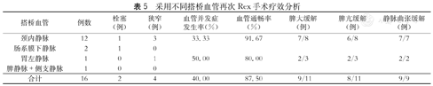 | 搭桥血管 | 例数 | 栓塞(例) | 狭窄(例) | 血管并发症发生率(%) | 血管通畅率(%) | 脾大缓解(例) | 脾亢缓解(例) | 静脉曲张缓解(例) |