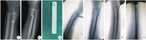 患儿全身麻醉,常规铅衣防护重要腺体,消毒铺巾后,取桡骨远端桡侧切口,长约1.5 cm,经C/G型臂X射线机透视确定桡骨远端骺板近端1~2 cm为进钉点,插入提前预弯的弹性髓内钉至骨折端0.5~1 cm。手法复位骨折,力求侧位骨折复位后对线良好,助手维持复位,保持肘关节伸直位。术者一手维持复位的骨折断端,一手握持手柄缓慢进钉,直至弹性髓内钉头侧预弯顶点通过骨折端且尾侧预弯顶点位于骨折线远端,此时透视可见骨折自然复位,后检查骨折端稳定性,确定骨折端弹性髓内钉把持良好,骨折端稳定(图2D)。剪断针尾,缝合,无菌敷料包扎,长臂石膏固定于肘关节屈曲90°、前臂旋转中立位。术后抬高患肢,4周去除石膏,行肘关节屈伸及前臂旋转功能锻炼。典型病例:患儿,女,7岁,经X线检查显示左侧桡骨远端MDJ骨折,术中操作见图3。