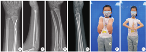 所有患儿均顺利完成手术,平均手术时间为33.9 min,范围在20.0~63.0 min;术中平均出血量为10.5 ml,范围在5.0~25.0 ml;平均透视次数为4.6次,范围在2~8次;切口平均长度为1.65 cm,范围在1.24~1.92 cm。所有患儿均获得解剖学或接近解剖学复位,均未发生医源性桡神经损伤,未发生浅表或深部感染。患儿平均随访时间为19.2个月,范围在6.0~31.0个月,骨折愈合满意后取出弹性髓内钉。随访中无患儿出现骨折再移位、畸形愈合、异位骨化及前臂旋转受限等,拇指背伸活动不受限,无拇长屈肌腱断裂。末次随访时Gartland和Werley腕关节评分为优20例,良1例,优良率为100%。所有患儿术后骨折正位对位率为(91.1±4.4)%,侧位对位率为(95.0±5.8)%,术后骨折正位成角为(2.8±1.2)°,侧位成角为(1.9±0.8)°。典型病例术后治疗结果见图4。