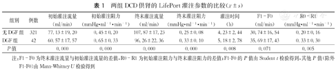 本研究讨论了DCD供肾的LifePort灌注参数与DGF发生情况和移植肾功能恢复正常时间之间的关系。单因素分析显示,初始和终末灌注参数(灌注阻力、灌注流量)及灌注时间均与移植后DGF的发生相关;多因素分析结果表明,终末灌注阻力是移植后发生DGF及移植肾功能恢复正常时间延长的危险因素。