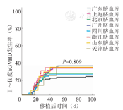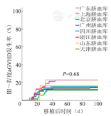 移植后100 d时,409例受者Ⅱ~Ⅳ度、Ⅲ~Ⅳ度aGVHD发生率分别为28.63%和15.7%,各脐血库提供的脐血移植后Ⅱ~Ⅳ度和Ⅲ~Ⅳ度aGVHD发生率相比,差异均无统计学意义(P值分别为0.809和0.68,图1、图2)。