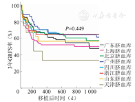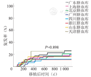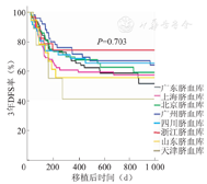 各脐血库提供的脐血移植后100 d时受者Ⅱ~Ⅳ度和Ⅲ~Ⅳ度aGVHD发生率、3年白血病复发率、3年OS、3年DFS和3年GRFS的差异均无统计学意义。各脐血库提供的脐血移植总体疗效之间没有差异,我们的技术体系中对没有植入的受者进行及时的二次移植,降低了移植相关死亡,弥补了由于植入失败而至存活率下降的问题。可见,建立标准化、规范化国家公共脐血库的质量管理体系是非常必要的,同时建立常态的临床医师评价体系,以促进脐血质量体系的完善和不断的提高,推动我国脐血移植的发展。