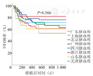 截止至2017年2月10日,409例受者随访时间中位数为472 d(27~1 080 d)。移植后3年的白血病复发率为15.89%,各脐血库提供的脐血移植后3年白血病复发率的比较,差异均无统计学意义(P=0.898,图3)。移植后3年时,409例受者的OS为66.7%,DFS为59%,GRFS为54.35%,各脐血库间提供的脐血移植后3年的OS、DFS和GRFS的比较,差异均无统计学意义(P值分别为0.566、0.703和0.449,图4、图5、图6)。