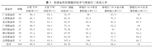 各脐血库的细胞回收率与移植后三系植入率