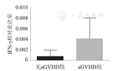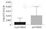 与无aGVHD组比较,aGVHD组TH1细胞相关因子IFN-γ和T-bet的表达水平均明显升高,两组比较,差异均有显著统计学意义(P<0.01,图4、图5)。将PPARγ表达量分别与IFNγ和T-bet表达量进行相关性分析,结果显示,相关系数分别为-0.3114(P<0.05)和-0.2997(P<0.05),PPARγ的表达与IFN-γ和T-bet的表达均呈负相关。