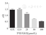 应用CCK8试剂盒检测PPARγ激动剂罗格列酮对淋巴细胞增殖的影响,结果显示,当罗格列酮浓度为12.5 μmol/L时对淋巴细胞增殖无明显效应,当罗格列酮从浓度25 μmol/L开始,随着浓度梯度的增加,淋巴细胞增殖程度逐渐显著降低,差异均有显著统计学意义(P<0.01,图6)。