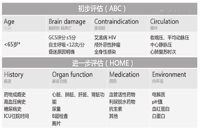 进一步评估(HOME)内容也包括4个大项,即:(1)病史详情(history),包括:(a)现病史,即受伤或发病以来情况和重症监护病房(ICU)住院时间;(b)既往史,有无高血压病、糖尿病、传染病和手术情况;(c)个人史,有无吸烟、饮酒、药物成瘾等情况。(2)器官功能状况(organ function),包括:(a)心脏参数:心肌酶及生化检查、脑钠肽、心电图、心脏超声检查等;(b)肺脏参数:呼吸机支持参数、动脉血气分析、胸部X线片或CT检查、纤维支气管镜检查情况;(c)肝脏参数:肝功能生化检查、肝脏超声或CT检查、肝功能储备检查情况;(d)肾脏情况:肾功能生化检查、肾脏超声或CT检查、尿量情况。(3)用药情况(medication),包括:(a)血管活性药物使用情况;(b)利尿药物使用情况;(c)抗生素使用情况;(d)其他可能对脏器功能损害的药物使用情况。(4)内环境(internal environment),包括:(a)血清钾、钠等电解质值;(b)血液pH值;(c)血红蛋白值;(d)血清白蛋白值。