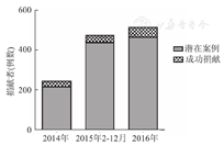 2014年、2015年2—12月和2016年分别上报潜在器官捐献者243、474和513例,分别成功实施器官捐献29、38和50例,潜在器官捐献者捐献成功率分别为11.9%、8.0%和9.7%。2015年2—12月和2016年潜在器官捐献者数较前一年分别增加了95.0%和8.2%,实际捐献例数分别较前一年增加31.0%和31.6%(图2)。