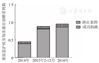 2014年、2015年2—12月和2016年每张重症监护病床潜在器官捐献者数分别为0.45、0.89和0.96例;每张重症监护病床实际器官捐献例数分别为0.055、0.077和0.096例(图3)。