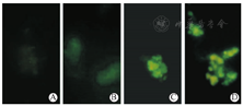 LV-VEGF165转染胰岛细胞24 h后,LV-VEGF165成功转染胰岛细胞,荧光显微镜下可见胰岛细胞内绿色荧光表达(AcGFP1)表达(图1),胰岛细胞感染率达90%以上。ELISA检测各组胰岛细胞分泌入上清液中VEGF165浓度结果显示,MOI为1、10、20、50时,VEGF165浓度于LV-VEGF165组均高于LV-AcGFP1组及空白对照组(P<0.01),LV-AcGFP1组与空白对照组比较,差异无统计学意义(P>0.05),说明LV-VEGF165转染胰岛细胞后体外成功表达目的基因VEGF165蛋白;不同MOI时LV-VEGF165组VEGF165浓度结果显示,MOI=20、50时分别为(478.64±89.31)pg/ml、(486.14±77.42)pg/ml均高于MOI=1、10时(45.76±8.47)pg/ ml、(281.46±63.16)pg/ml(P<0.01),MOI=20、50时VEGF165浓度差异均无显著性(P>0.05),结合不同MOI时胰岛细胞内绿色荧光表达强度,说明LV-VEGF165体外转染胰岛细胞的最佳MOI=20(图2A)。ELISA检测胰岛细胞移植后第1、3、5、7、14天LV-VEGF165组血清VEGF165浓度分别为(241.67±10.34)pg/ml、(247.81±11.78)pg/ml、(239.74±12.21)pg/ml、(242.83±11.24)pg/ml、(238.52±12.71)pg/ml均高于LV-AcGFP1组的(21.37±2.43)pg/ml、(19.24±2.41)pg/ml、(24.38±2.74)pg/ml、(22.44±3.04)pg/ml、(23.21±2.62)pg/ml及空白对照组的(22.74±2.31)pg/ml、(23.31±2.47)pg/ml、(22.81±2.97)pg/ml、(20.14±2.84)pg/ml、(22.73±2.42)pg/ml(P<0.01),各组血清VEGF165浓度结果显示,转染LV-VEGF165的胰岛细胞在体内能够稳定表达VEGF165蛋白(图2B)。