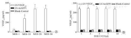 应用RT-PCR技术克隆目的基因VEGF165片段,用以构建慢病毒主体质粒pLVX-EF1α-VEGF165-IRES2-AcGFP1,大肠杆菌TOP10内转化,并与辅助质粒gag-pro、vpr-pol、Tet-Off®、tat-IRES-rev和包膜质粒env(VSV-G)共转染Lenti-X 293T包装细胞,培养上清液内收集LV-VEGF165,同法制备LV- AcGFP1[5]。