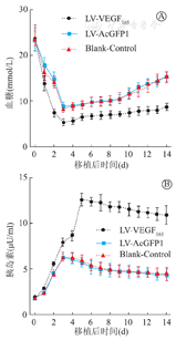 多元分析结果显示,胰岛细胞移植后,LV-VEGF165组血糖及血清胰岛素浓度与LV-AcGFP1组及空白对照组比较,差异均有显著性(P<0.01);LV-AcGFP1组与空白对照组比较,无统计学意义(P>0.05,图3)。LV-AcGFP1组及空白对照组血糖浓度于移植术后下降3 d后均逐渐升高,后分别波动于8.98~15.31 mmol/L及8.83~15.08 mmol/L;LV-VEGF165组血糖浓度于移植术后第2天恢复到正常水平(图3A)。LV-VEGF165组血清胰岛素浓度于移植术后第5天达到峰值,后保持在12.57~10.91μU/ml的高水平;LV-AcGFP1组及空白对照组于移植术后升高3 d后分别维持在4.04~6.08 μU/ml及4.43~6.32 μU/ml的相对较低水平(图3B)。
