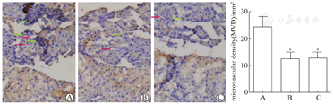 取移植后第14天的胰岛移植物,4 g/L的多聚甲醛中固定24 h,然后制作4 μm的石蜡切片,行兔抗鼠胰岛素单克隆抗体及羊抗鼠CD31单克隆抗体免疫组化双染。微血管密度(microvascular density, MVD)的测量参照Sakata报道的实验方法[9],根据移植物CD31免疫组化染色,在100倍光镜下记录5个视野内CD31阳性血管的数目,计算单位面积的平均MVD。