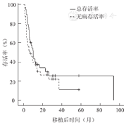 对于接受allo-HSCT的难治/复发AML患者,移植后复发是治疗失败的主要原因。目前研究认为移植后给予预防性DLI诱导移植物抗白血病效应可以降低复发率,提高移植疗效。Jaiswal等[17]对41例难治/复发AML患者进行allo-HSCT,其中21例患者移植后接受预防性DLI,余20例患者未接受预防性DLI。结果显示,接受预防性DLI的患者移植后18个月的无进展存活率(61.9%与25%,P=0.02)、总存活率(70.5%与35%,P=0.03)明显较高,而疾病进展率明显较低(21.4%与66%,P=0.01)。王昱等[5]也发现,接受预防性DLI的患者移植后3年总存活率较高(38.0%与11.8%,P<0.05)。在本研究中,11例患者移植后给予预防性DLI,输注中位时间为移植后第52(27~107)天。预防性DLI与否患者移植后2年总存活率(20.0%与34.7%,P=0.67)、无病存活率(9.1%与36.5%,P=0.402)无显著差异,可能与本研究中接受预防性DLI的病例数较少有关,还有待更多大样本前瞻性研究证实。