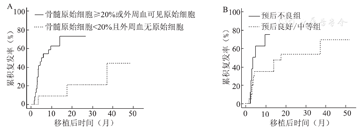至随访终点,21例(53.8%)患者复发,复发中位时间为移植后3.7个月(1.4~37.1个月),其中17例(81.0%)患者在移植后1年内复发。髓外复发5例,其中3例合并血液学复发,至随访终点1例存活,4例死亡;余16例均为血液学复发,至随访终点无一例存活。移植后2年累积复发率为56.63%(95%CI 37.84%~71.71%)(图2)。单因素分析发现预处理前骨髓原始细胞比例≥20%或外周血可见原始细胞的患者移植后2年累积复发率明显较高(70.83%与20.22%,P=0.002)(图3A)。此外,伴有预后不良遗传学特征的患者移植后复发率也较高(P=0.047,图3B)。多因素分析显示,预处理前高肿瘤负荷(HR=13.3,P=0.018)是影响移植后复发的独立危险因素。