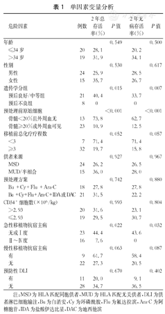 | 危险因素 | 例数 | 2年总存活率(%) | P值 | 2年无病存活率(%) | P值 | |