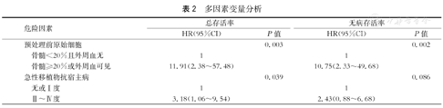 随访至2017年8月1日,随访时间中位数为9.1个月(1.6~93.8个月)。11例(28.9%)患者存活,10例(26.3%)患者无病生存,存活病例的中位随访时间数为25个月(7.2~57.7个月)。移植后预期2年总存活率为(30.0±8.0)%,2年无病存活率为(26.7±7.7)%(图1)。单因素变量分析发现,伴有以下危险因素:预处理前骨髓原始细胞比例≥20%或外周血可见原始细胞,预后不良遗传学分组、移植后发生Ⅱ~Ⅳ度急性GVHD的患者移植后总存活率和长期无病存活率较差。而患者的年龄、性别、疾病阶段、供者来源、回输CD34+细胞数、预处理方案、移植后有无发生慢性GVHD、预防性DLI与否等对移植后总存活率、无病存活率均无显著影响(表1)。多因素分析显示:预处理前骨髓原始细胞比例≥20%或外周血可见原始细胞的患者移植后总存活率(HR=11.91,P=0.003)、无病存活率(HR=10.75,P=0.002)明显较低。多因素变量分析还发现,移植后发生Ⅱ~Ⅳ度急性GVHD也是影响总存活率(HR=3.18,P=0.039)的独立危险因素(表2)。