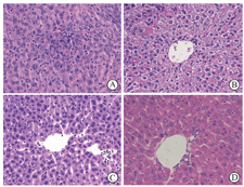 小鼠急性肝功能衰竭组和辅助性部分原位肝移植组术后6 h和24 h肝脏组织HE染色。急性肝功能衰竭组术后6 h可见肝组织有大量中性粒细胞和淋巴细胞浸润,24 h可见肝细胞大量水肿坏死,正常肝小叶的结构紊乱。辅助性部分原位肝移植组术后6 h和24 h,受鼠自身肝脏的组织结构相对正常,中央静脉周围细胞无水肿,肝细胞无明显坏死、无明显炎性细胞浸润和结构紊乱。