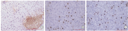 手术后在6 h、24 h和36 h取小鼠血液和肝组织,一部分肝组织用稀甲醛溶液保存,另一部冻存于液氮中,保存备用。小鼠血液使用EDTA-K2试管储存后离心(1200×g)5 min,取上清液每管100 μl存放于EP管中,置于-70 ℃冰箱备用。一部分肝脏于质量分数为100 g/L甲醛溶液内固定24 h后,石蜡包埋制成切片,便于行免疫组织化学检查。