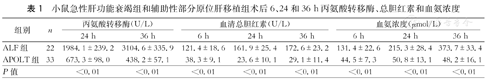 小鼠急性肝功能衰竭组和辅助性部分原位肝移植组术后6、24和36 h丙氨酸转移酶、总胆红素和血氨浓度