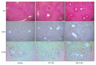 HE染色发现与对照组相比,IRI组出现肝损伤区域,并且HKO-IRI组损伤区域明显大于WT-IRI组(P<0.05,图1),IHC染色表明与对照组相比,IRI组肝组织中巨噬细胞和中性粒细胞浸润增加,且与WT-IRI相比,HKO-IRI组增加更为明显(P<0.05,图1)。以上结果表明,RIPK3的敲除明显增加了小鼠肝缺血再灌注的损伤。