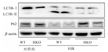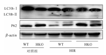 与对照组相比,IRI组小鼠肝组织明显受损,但是与WT-IRI组相比,HKO-IRI组肝损伤显著加重(P<0.05),进一步研究发现其肝组织中LC3-Ⅱ蛋白含量明显下降,P62蛋白含量增加。同样,肝细胞缺氧复氧后,相对于WT鼠,HKO来源的肝细胞损伤也更重。