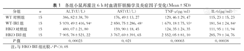 与假手术组相比,IRI组的血清ALT和AST水平均明显升高(P<0.05,表1),与WT-IRI组相比,HKO-IRI组血清ALT和AST水平升高更为明显(P<0.05,表1)。