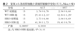 提取WT小鼠和RIPK3敲除小鼠的原代肝细胞,贴壁后做缺氧复氧实验,相比于WT鼠的原代肝细胞,HKO鼠的原代肝细胞缺氧复氧损伤更为严重严重,上清中ALT/AST的含量更高(P<0.05,表2)。与WT-HIR组相比,HKO-HIR组小鼠肝细胞中的LC3-Ⅱ蛋白表达受到抑制,而P62蛋白含量明显增加(图3),表明缺氧复氧后,相对于WT-HIR组,HKO-HIR组小鼠肝细胞自噬,明显减少。