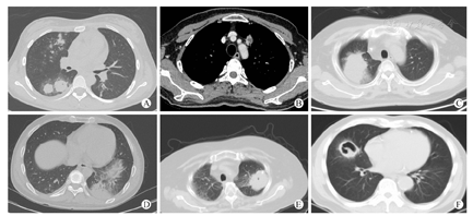曲霉菌感染最常见的影像表现是多发大结节(图1),占75.8%,伴或不伴晕征(图2A),伴或不伴内部低密度及空洞(图2B),部分可见空气半月征。其他表现依次为实变(图2C、图2D)、肿块(图2E、图2F)、小结节及树芽征,大结节、实变及肿块可单独出现,小结节及树芽征多为伴随表现。出现胸腔积液的比例差异无统计学意义。
