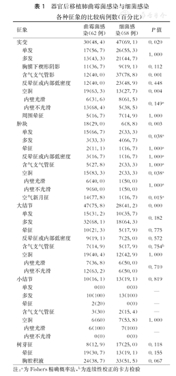 | 征象 | 曲霉菌感染(62例) | 细菌感染(68例) | P值 | |