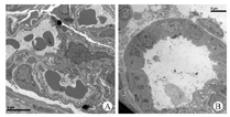 2.Lewis→Balb/c裸小鼠移植后4周,E16Balb/c移植后肾(n=5),呈肾形,质软,输尿管发育良好,内有较多的囊性积尿;皮质和髓质清晰显现。皮质中含红细胞的肾小球、近端小管、远端小管和集合管发育完好,少有淋巴细胞浸润(图1)。电镜显示:肾小球的内皮、系膜和足细胞,基底膜及足突形态结构正常;近端小管和远端小管的上皮细胞,集合管上皮细胞发育良好(图2)。E15Balb/c、E16Balb/c和E17Balb/c三组(n=10)Banff排斥分级差异无统计学意义(P>0.05,表1)。
