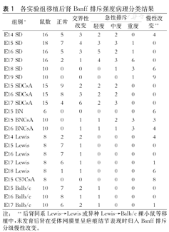 推测远交系SD大鼠品系之间亲缘程度较高,细胞排斥反应强度低,故而又选用主要组织相容性复合物(MHC)差异大、细胞排斥反应强度高的Lewis→BN品系验证。不使用CsA,E15 BN后肾(n=6)移植后2周即遭完全排斥,与Rogers等[2]报道不使用免疫抑制剂,在PVG(RT1c)到PVG(RT1avl)MHC不同的大鼠品系间诱导出外周耐受显然不同。为避免样本偏差,再次使用CsA (12 mg·kg-1·d-1)皮下注射4周,发现E1 5CsABN、E16 CsABN发育后肾中度以上Banff排斥分级仍占80 %(8/10例);若停用CsA,后肾皆被排斥。提示单纯CsA皮下注射,可能不足以完全抑制细胞性排斥反应,也间接提示细胞排斥反应是后肾移植的障碍之一。
