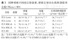 移植后4周,部分Balb/c裸小鼠移植后肾积尿现象,呈淡黄色、澄清。E15Balb/c与E16Balb/c湿重(P>0.05,t=0.61)、积尿尿素氮(P>0.05,t=-0.17)和肌酐值(P>0.05,t=0.33)差异无统计学意义。E16Balb/c与E17Balb/c湿重(P>0.05,t=0.09)、积尿尿素氮(P>0.05,t=0.52)和肌酐值(P>0.05,t=0.34)差异无统计学意义(表2)。
