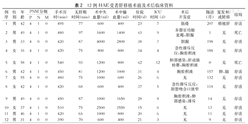 12例受者均接受OLT,术后病理检查结果证实为HAE。手术时间为(456.25±44.98)min;术中失血量中位数为1 000 ml(600~4 000 ml);输血量中位数为800 ml(400~3 550 ml);无肝期时间(79.17±10.01)min(表2)。6例HAE受者均放置T管引流,其中2例术后出现胆漏,经再次手术置入T管引流后好转。发生急性排斥反应的2例受者,给予甲泼尼龙冲击治疗后黄疸消退,血清胆红素恢复正常。2例因病灶浸润腔静脉处理困难,术中行下腔静脉重建术。2例受者术中发现病灶侵犯横膈而行横膈切除术。9例受者术中发现严重的浸润,粘连和纤维增生,对肝门的处理复杂,辨认门静脉、胆总管和肝动脉十分困难。我们在这些受者中均采用了严律南等[12]首先报道的先转流后游离肝周韧带技术。