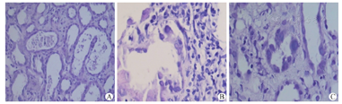 62例受者常规行血液及尿液BKV-DNA定量检测。其中检测结果阳性的受者行移植肾穿刺活检术进一步明确诊断(图1)。另外通过收集受者尿液进行decoy细胞检测也可以初步诊断BKV感染,但decoy细胞监测BKV感染的灵敏度和特异度均较低,存在细胞收集困难、细胞破坏、标本污染等问题,同时与JC病毒鉴别困难,判断的主观性强,因此我科并未进行这一检测。