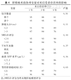 本研究显示了肝移植受者术后良好的总体存活率(术后1、3、5年存活率分别为91.7%、88.1%、82.1%)。病理检查中肿瘤的特征被发现与存活时间缩短具有统计学上的相关性。我们也发现,受者移植等待时间>6个月的在单变量分析中有较好的预后(表4)。这些数据进一步提示了观察至少6个月时间在移植前对于选择更佳的HCC生物学行为的HCC患者是有用的。