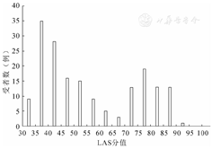 173例肺移植受者的LAS分值为(56.63±18.39)分(32.79~90.70分),LAS的分布如图1。图中LAS分布出现两个高峰,第一个高峰(35~55分)以术前吸氧及无创通气的受者为主,第二个高峰(70~90分)以间质性肺疾病气管插管的受者为主。