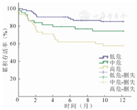 以LAS分值分为3组:<50分(低危组);50~75分(中危组);>75分(高危组)。低危组84例,中危组44例,高危组45例,三组受者年龄差异无统计学意义(P=0.521);低危组以COPD吸氧的受者为主,高危组以间质性肺疾病气管插管的受者为主(表1)。三组受者术后90 d存活率分别为90.5 %、81.8 %和71.1 %;术后1年存活率分别为85.4 %、74.4 %和57.8 %,差异均有统计学意义(P=0.002)。三组受者术后的生存曲线见图2。