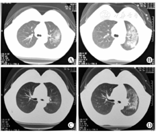 例1 2020年1月17日最高体温38.7 ℃,后体温逐日下降,2020年1月18日最高体温37.3 ℃,2020年1月19日最高体温36.9 ℃,自感无异常,睡眠、食欲、精神均可。入院辅助检查结果:细菌、真菌、病毒等均阴性;复查血常规白细胞正常范围(4.24×109/L,参考区间3.5×109~9.5×109/L),较入院时有下降趋势;淋巴细胞计数低(0.60×109/L,参考区间1.0×109~3.2×109/L,发病前随访淋巴细胞计数均在正常值范围);CRP增高(43.4 mg/L,参考区间0~10 mg/L);PCT临界范围(0.101 μg/L,参考区间<0.1 μg/L);细胞免疫提示机体免疫力极低(CD4计数186×109/μL,参考区间404×109~1 612×109/μL)。受者体温逐渐恢复正常,未调整治疗方案。2020年1月20日再次出现发热,最高体温38.3 ℃,少许干咳,尿量约2 L/d,查体无明显阳性体征,辅助检查结果:他克莫司血药浓度7.6 μg/L、血肌酐197 μmol/L,排斥反应可能性小。立即复查胸部CT对比2020年1月16日CT提示:双肺感染,较前进展(图1)。拟行纤维支气管镜检查,受者拒绝。调整治疗方案:停服他克莫司,改为甲泼尼龙40 mg/d静脉滴注,给予人血丙种球蛋白10 g/d静脉滴注,口服头孢哌酮钠他唑巴坦钠改为盐酸莫西沙星继续联合磺胺抗感染,继续更昔洛韦+奥司他韦抗病毒,继续泊沙康唑抗真菌治疗,申请2019-nCoV核酸检测,同时给予单间病房隔离治疗。