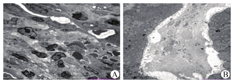入院检查:体温36.5℃,脉搏109次/min,呼吸25次/min,血压117/80 mmHg。神志清楚,呼吸稍促,无杵状指,全身浅表淋巴结未触及肿大;呼吸节律两侧对称,触诊语颤减弱,双肺叩诊呈清音,听诊双肺呼吸音弱,可闻及湿罗音,内脏反位,心尖搏动点位于第五肋骨右锁骨中线内0.5 cm处,搏动范围正常,各瓣膜区未闻及病理性杂音,腹部触诊无异常,有杵状指。血气分析提示II型呼吸衰竭。深部痰培养结果,多次为铜绿假单胞菌。术前因严重呼吸衰竭,无法完成肺功能检测。胸部CT检查提示:全内脏倒置,两肺多发支气管扩张并感染;肺气肿,两肺多发肺大泡。鼻窦CT平扫:双侧上颌窦、筛窦、右侧额窦全组副鼻窦炎。心脏彩超:射血分数77 %,镜像右位心,右心增大,三尖瓣反流(轻度),肺动脉高压(中~重度),三尖瓣反流面积4.4 cm2,估测肺动脉收缩压74 mmHg。肝胆脾胰彩色超声检查提示:内脏转位,余未见异常。入院诊断为Kartagener综合征可疑。行鼻腔纤毛糖精试验>30 min;支气管黏膜电镜检查:支气管黏膜组织,局部可见鳞状上皮化生,偶见支气管柱状上皮,黏膜上皮部分脱落,部分未脱落上皮表面可见少量微绒毛,上皮下黏膜间质可见淋巴细胞、单核细胞浸润,符合炎症性改变,经多次病理切片镜下未见纤毛组织(图2)。