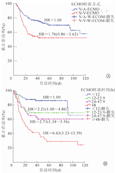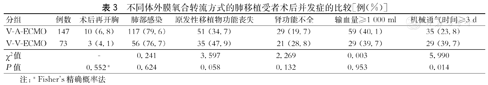 综上所述,本研究显示当前ECMO应用原则下,V-A和V-V转流方式的选择对肺移植受者术后并发症和短期生存率的影响相当,转流时间对受者短期存活时间具有预测价值,对于符合撤机条件的受者应尽早撤除ECMO。