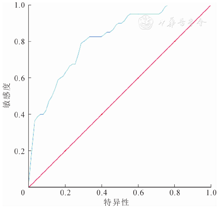 预测评分模型经ROC曲线(图1)分析得曲线下面积为0.813,95%可信区间为0.731~0.896(P<0.001),具有较好的判断意义。其约登指数(Youden's index)为0.514,灵敏度和特异度分别为80.0%和71.4%。