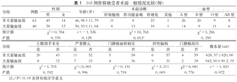 103例肝移植受者术前一般情况比较(例)