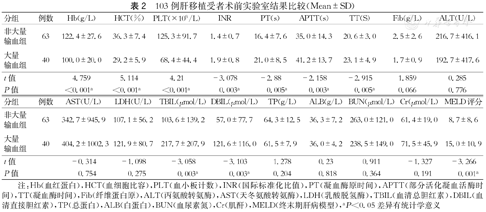 103例肝移植受者术前实验室结果比较(Mean±SD)