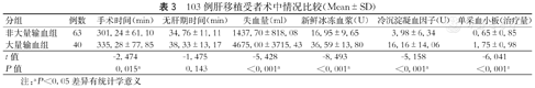 103例肝移植受者术中情况比较(Mean±SD)