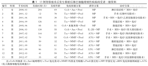 13例肾移植术后发生移植后淋巴细胞增殖性疾病的受者一般资料