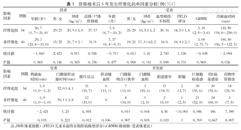 肝移植术后5年发生纤维化的单因素分析[例(%)]