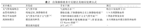 随着肺移植的手术技术不断改进和移植肺保存技术的出现,术后支气管并发症的发生率从1983年以前的80%下降到不足3%[22]。肺叶再植术中,支气管残端通常大小不等,远处残端薄且易碎,比同种异体肺移植支气管可供吻合的残端长度更短,吻合张力的牵拉作用易造成术后支气管吻合端口的开裂,继而可能出现吻合口感染、并发症和局部肺癌复发。Shiono等[20]提出,可将支气管经下肺静脉转位后来与侧壁气管吻合的气管重建技术来缓解支气管吻合端口的压力,以完成移植环节中支气管的重建,或将气管侧壁打孔处理,将下叶肺支气管残端穿插在主气管打孔处以进行吻合以降低术后支气管并发症。除此之外,Inci等[22]也指出,重新建立气管、支气管处血管的微循环,减少吻合端支气管缺血也利于术后的恢复(表2)。