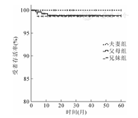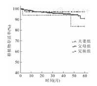 本研究中共有4例受者死亡,其中1例因心力衰竭,3例因间质性肺炎。三组受者5年存活率分别为100%、98.8%及98.7%,组间比较差异无统计学意义(P=0.892,图1)。对三组受者移植肾功能丧失的原因分析:夫妻组中1例因超急性排斥反应、1例因IgA肾病复发;父母组中6例因急性排斥反应、8例因慢性排斥反应、1例因移植肾结石;兄妹组中2例因急性排斥反应,其3年移植肾存活率分别为94.1%、95.9%及97.3%,其5年移植肾存活率分别为83.7%、91.0%及97.3%,组间比较差异无统计学意义(P=0.260,图2)。
